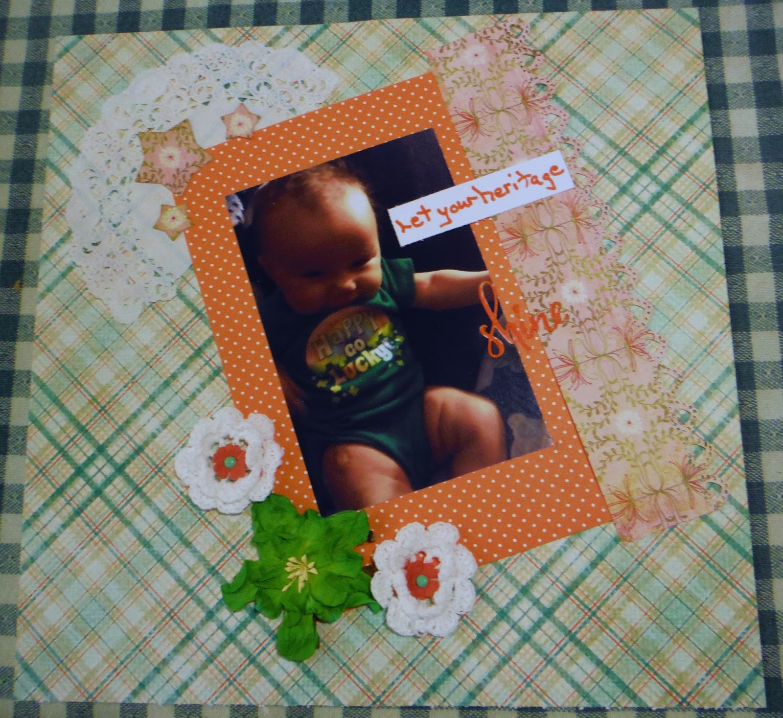 This LO was inspired by Mary's Tic Tack Toe over on Souls Scrappers. For this challenge you get to pick from a Tic Tack Toe board you all remember how that goes. I find it is helpful if you get stuck on a LO you can get ideas from the board. As it so happens I did two lines the first one is Doily, Green, and 2 different pattern papers. My LO still needed a few things so I took inspiration from the rest of the board and added enamel dots in the flowers, a journaling strip and stars.